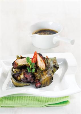Ambil selembar daun pandan, bungkus dan ikat potongan ayam dengan daun pandan hingga benar-benar tertutup rata.